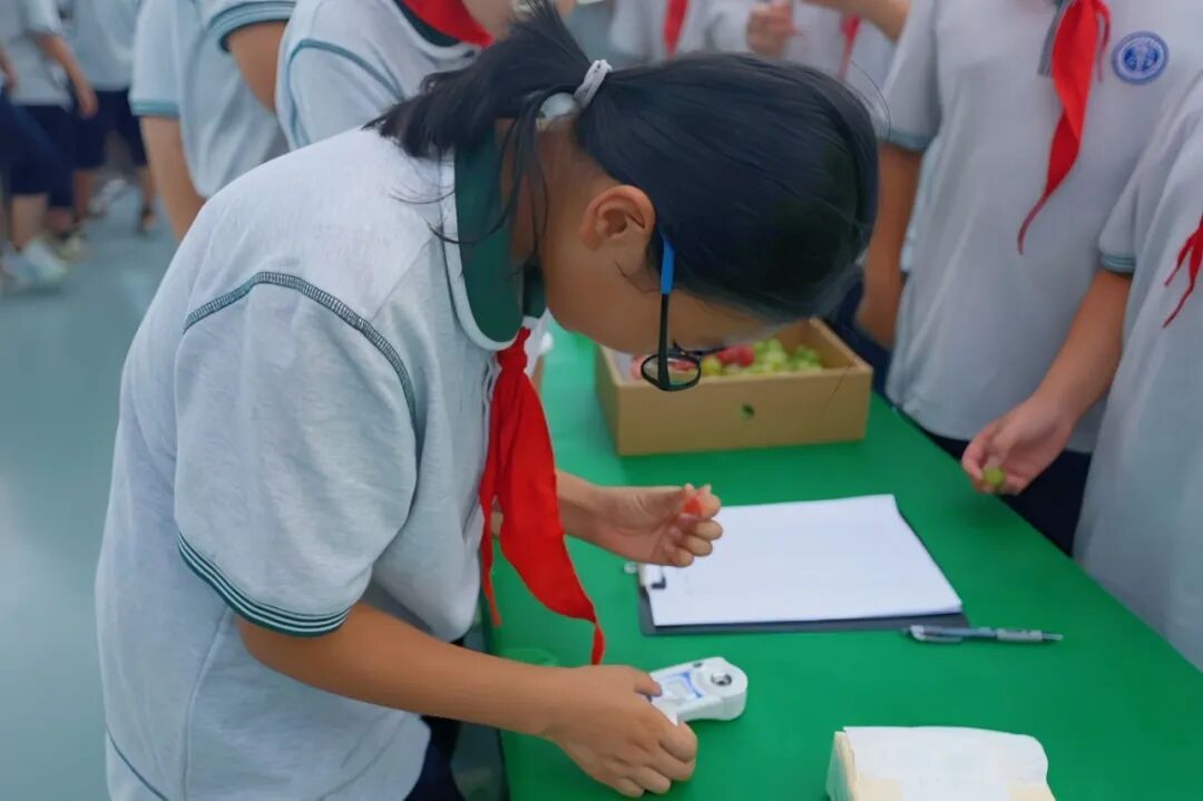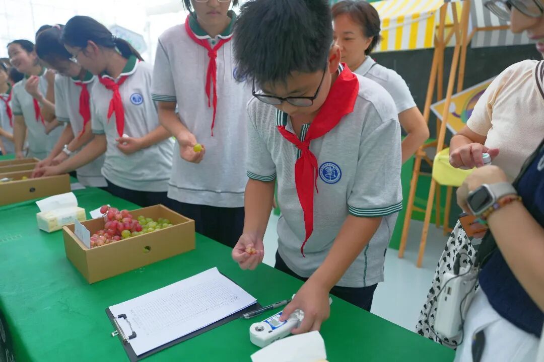 随后,同学们分组开展实验,探索葡萄成熟度与甜度的奥秘。闫莉春老师向大家介绍了糖度计的使用方法,以及如何通过外观、触感判断葡萄的成熟度。同学们选取“紫金秋浓”与“紫金红霞”两个品种的葡萄样本,又针对每个品种挑选了不同成熟度的葡萄,小心翼翼地将葡萄汁滴入糖度计中,认真记录下每一组数据。实验过程中,同学们还不忘品尝不同葡萄的味道,将实验数据与口感体验相结合,通过串联起课堂上学过的知识,进一步感受葡萄成熟度与甜度之间的关联,理解 “果实成熟过程中营养成分变化” 的科学原理,让这场实验成为理论与实践深度融合的生动课堂。