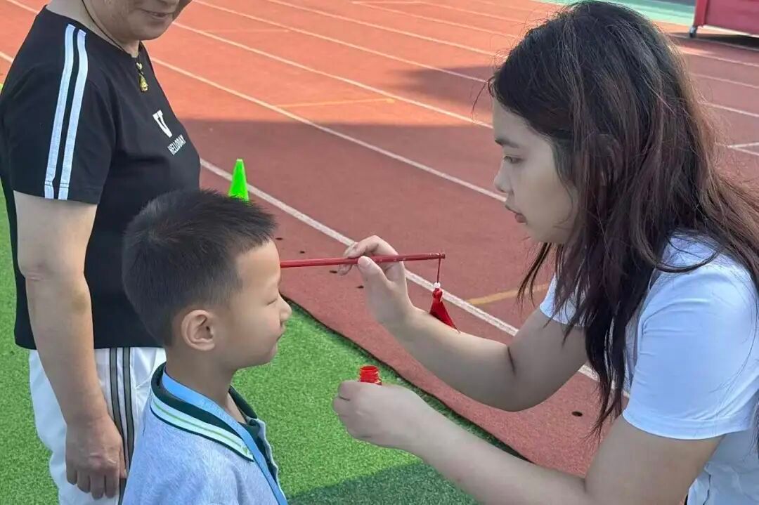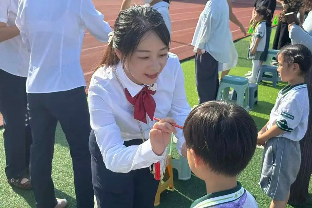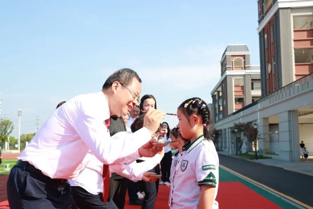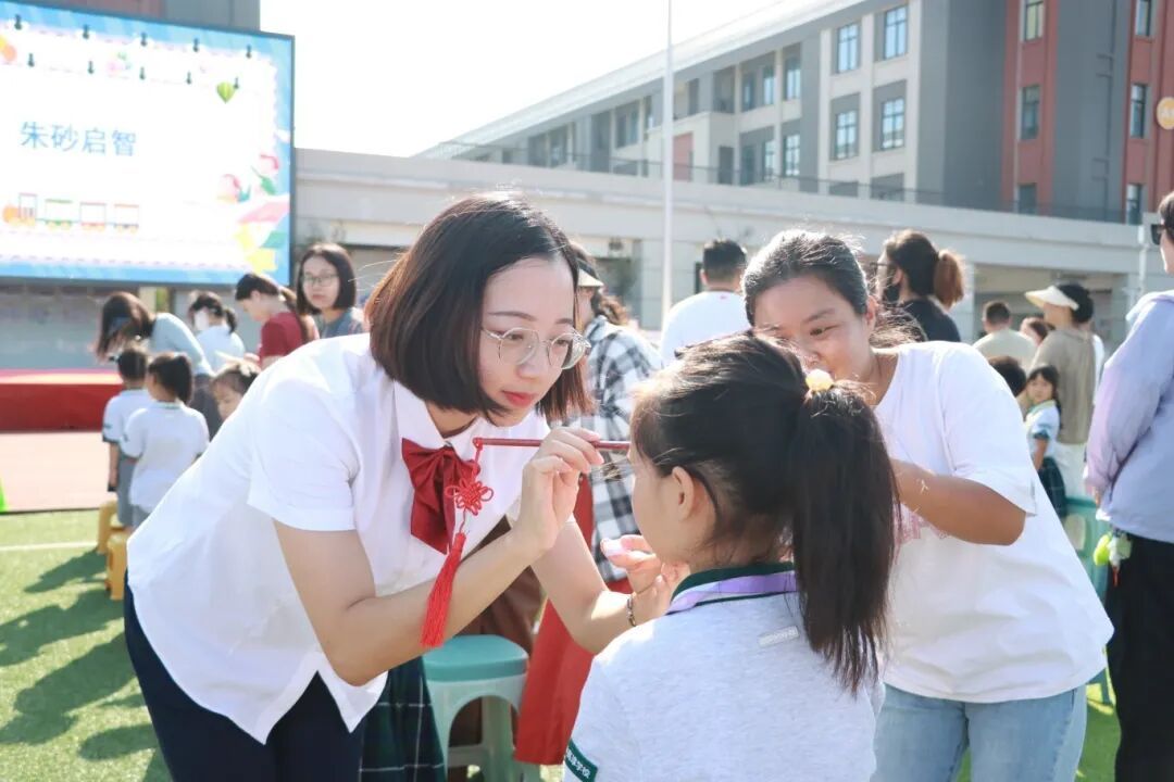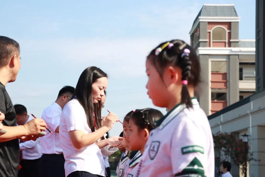 接下来,各级领导和教师代表为新生进行朱砂启智。一点朱红印于眉间,恰似为孩子们开启了智慧的天窗。