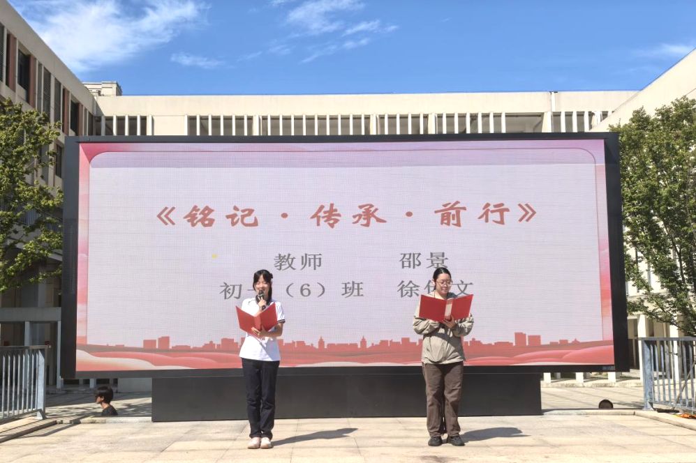 在主题环节中,邵景老师与初一6班徐伊文同学共同带来了《铭记·传承·前行》的师生对话。通过真实的历史叙述和深刻的思考交流,带领全体师生回顾了九一八事变那段屈辱与抗争的历史。邵景老师指出:“历史是最好的教科书,也是最好的清醒剂。我们要从历史中汲取智慧和精神力量。”徐伊文同学表示:“作为新时代青少年,我们要牢记历史,更要珍惜当下,用实际行动报效祖国。”
