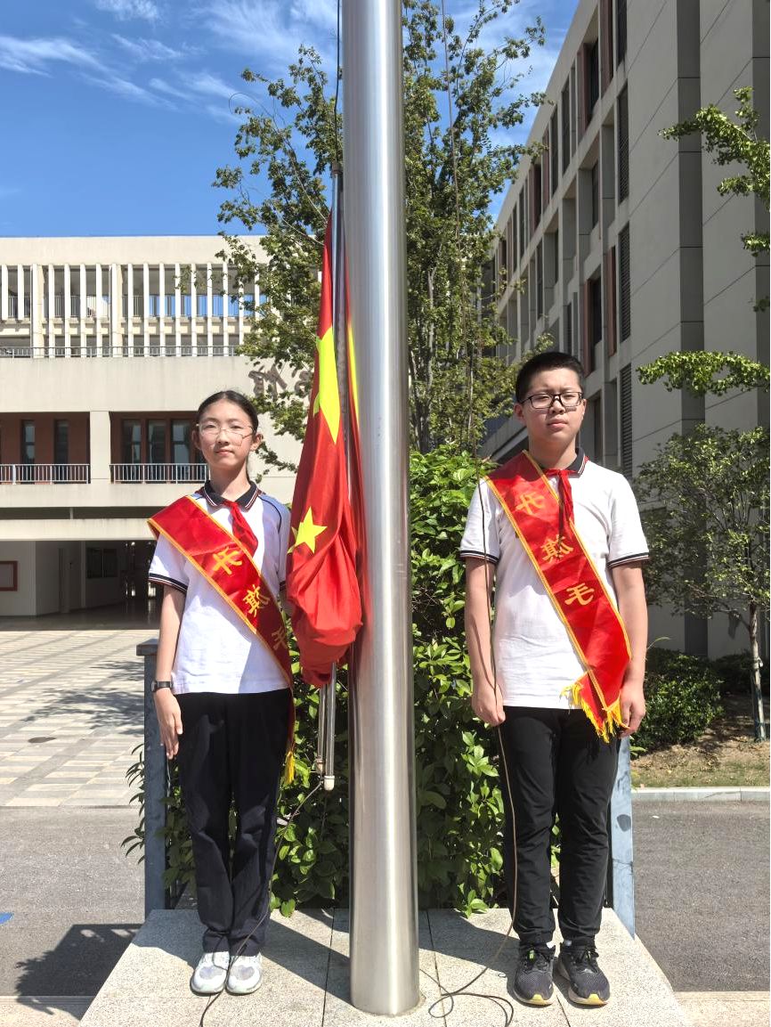 晨会在庄严的升旗仪式中拉开帷幕。初一(6)班谢心乐同学和初二(1)班柳子宸同学担任升旗手,在全体师生的注目下,鲜艳的五星红旗冉冉升起,迎风飘扬。