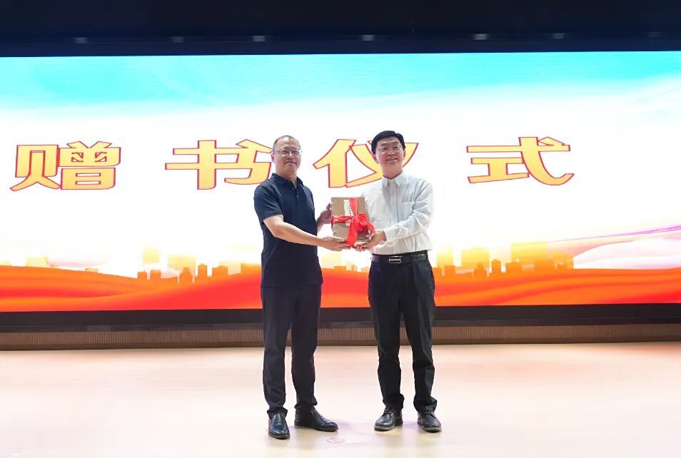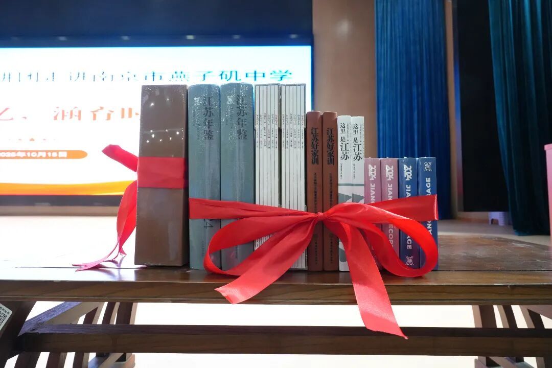刘立军代表省志办向学校捐赠《长江历史图谱》《这里是江苏》等13册志鉴书籍。一本本厚重的典籍,为燕子矶中学的校园文化建设添上了浓墨重彩的一笔。