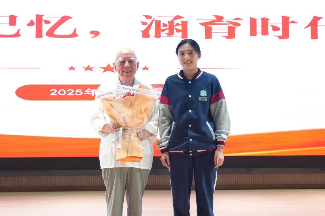 宣讲尾声,学生代表向戴国林老师敬献鲜花。鲜艳的花朵既承载着对老人跨越近百年人生的敬重,更饱含着青年一代对南京大屠杀历史见证者的感恩。相信戴老师的故事,也将在燕子矶中学的校园里,在一代又一代青年的心中,生根发芽,永续传承。