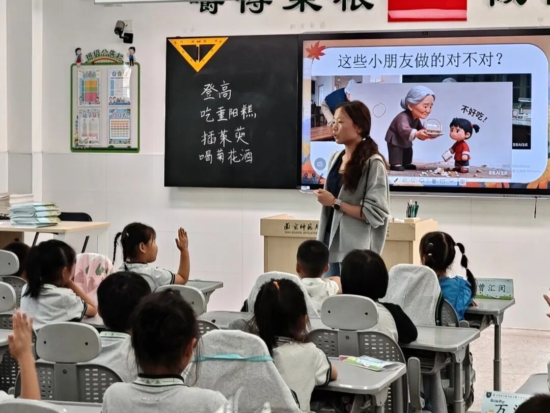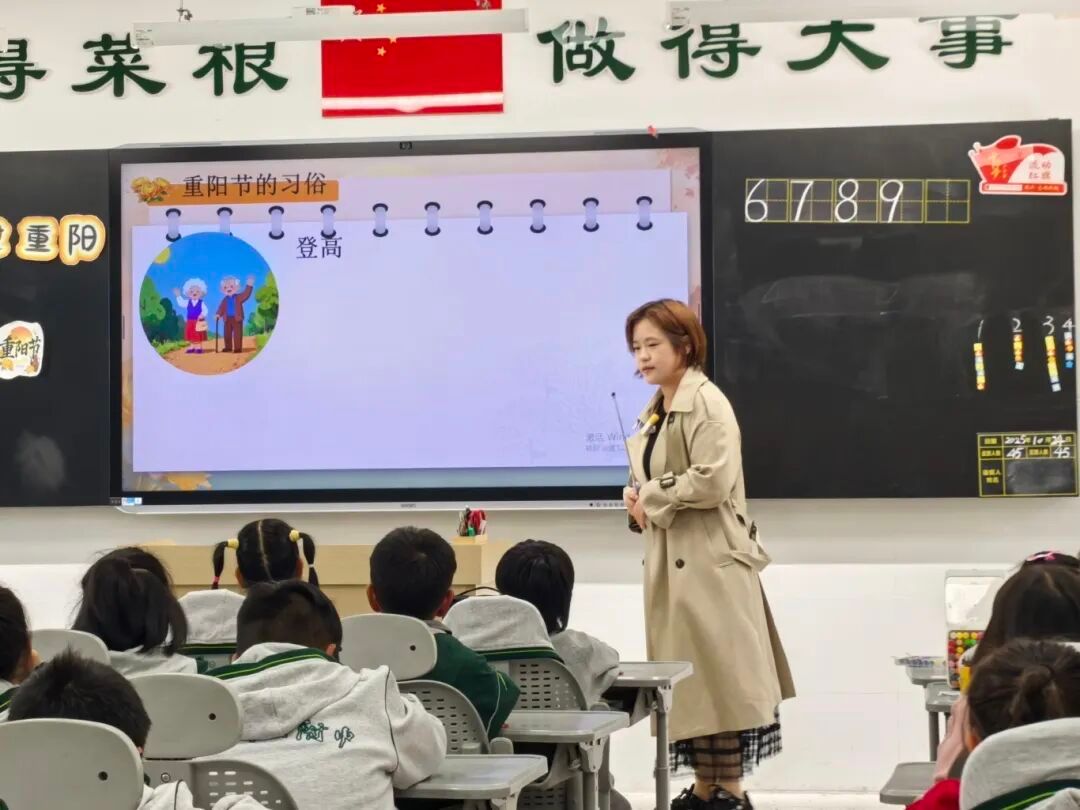 韩欣怡老师执教《尊老爱老过重阳》,介绍登高、吃糕、插茱萸、饮菊花酒习俗,以图片、视频等多种形式引导学生在活动中体验,用实际行动传递尊老爱老情。