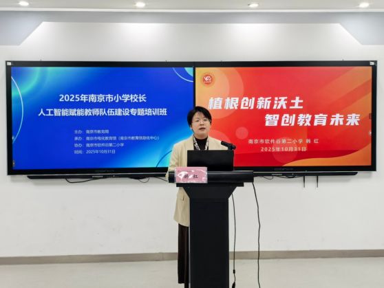 为深入贯彻落实国家教育数字化战略行动,推动人工智能与教师队伍建设的深度融合,2025年10月31日,南京市“小学校长人工智能赋能教师队伍建设专题培训班”在雨花台区顺利举办。本次活动南京市教育局主办,南京市电化教育馆(南京市教育信息化中心)承办,南京市软件谷第二小学协办,来自全市约70位小学校长、分管校长及市区相关领导齐聚一堂,共同探讨AI赋能教育的新路径、新样态。